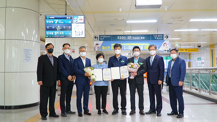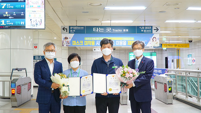 이승준·채수자 역무원은 지난 5월 6일 19시경, 정부청사역 대합실에서 불안한 표정으로 떨고 있는 50대 여성을 발견하고 역무실로 안내해 자초지종을 확인한 뒤 보이스 피싱임을 직감하고 곧바로 112에 신고해 시민의 소중한 재산을 지켜냈다.