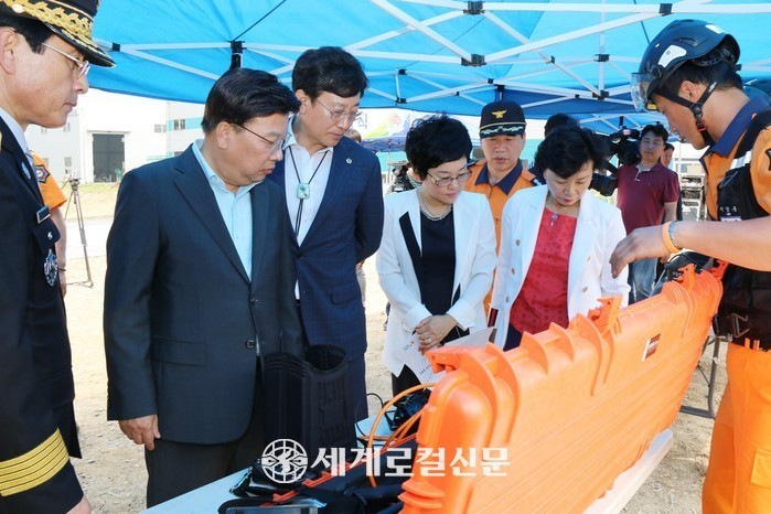 | ▲ 권선택 대전시장을 비롯해 김경훈 시의장, 박혜련·박상숙 시의원, 소방관계자 등이 지난 6월 29일 119 특수구조단 발대식에서 소방장비 설명을 듣고 있다. <사진=오영균 기자> |