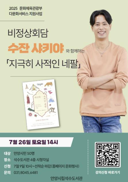 첫 번째 강연은 7월 26일 오후 2시부터 석수도서관 4층 시청각실에서 열린다. 네팔 출신 방송인 수잔 샤키야가 강사로 나서 ‘문화 차이에서 다양성으로’라는 주제로 네팔의 문화와 정체성, 그리고 다문화 사회에서의 소통 방법에 대해 강연한다.