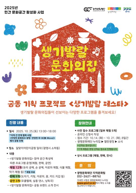 '생기발랄 문화의집'은 광명시 곳곳에 위치한 공방, 연습실, 카페 등 다양한 공간이 시민의 일상에 새로운 영감을 불어넣고, 따뜻한 만남이 피어나는 문화의 쉼터가 될 수 있도록 지원하는 사업이다.