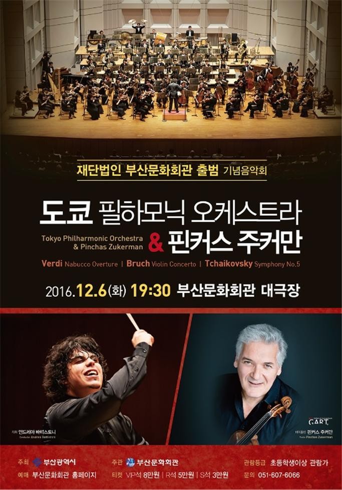 이번 공연은 내년 1월1일 재단법인 출범을 앞두고 부산문화회관은 음악계의 신선한 바람을 불러일으킨 20대 지휘자 안드레아 바티스토니가 이끄는 역사 깊은 도쿄 필하모닉 오케스트라와 세계적인 바이올리니스트 핀커스 주커만의 초청공연이다.