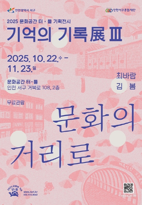[세계로컬타임즈] 인천서구문화재단은 10월 22일부터 11월 23일까지 문화공간 터·틀(석남)에서 기획전시 기억의 기록展 세 번째 시리즈 ‘문화의 거리로’를 개최한다.