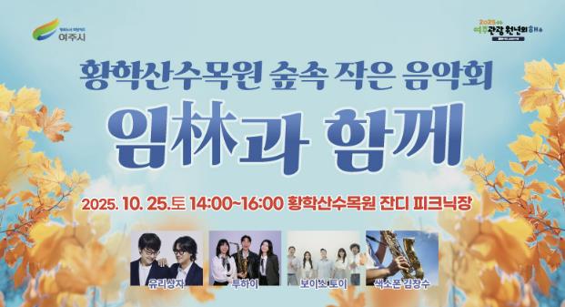 [세계로컬타임즈] 여주시는 오는 10월 25일 오후 2시부터 4시까지 황학산수목원 잔디피크닉장에서 ‘임(林)과 함께’ 음악회를 연다고 밝혔다.