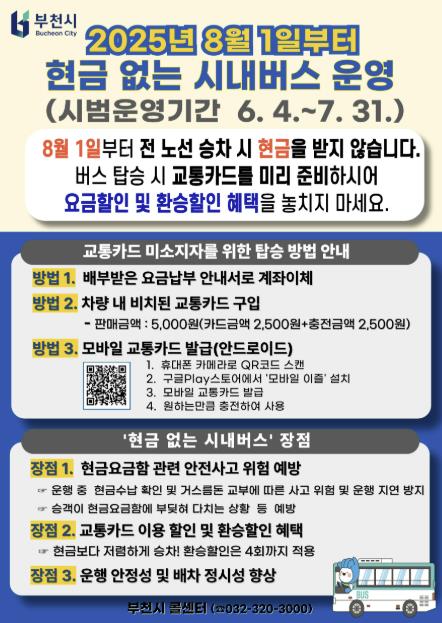 [세계로컬타임즈] 부천시는 6월 4일부터 7월 31일까지 ‘현금 없는 시내버스’ 시범운영을 시작하고, 8월부터 전면 시행할 계획이라고 밝혔다.