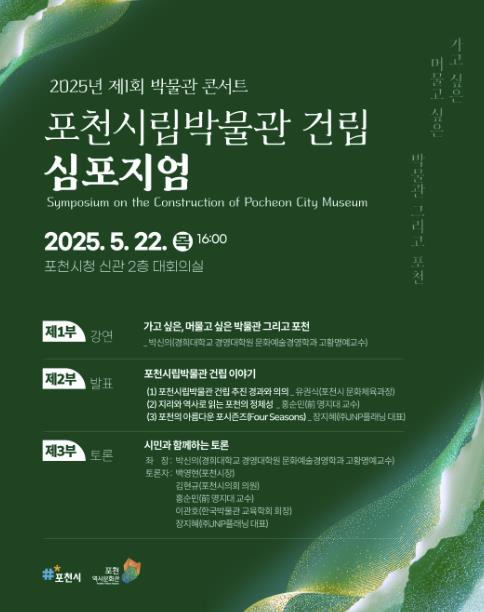 1부 강연에서는 경희대학교 박신의 교수가 복합문화공간으로 변화하는 박물관의 역할과 흐름을 소개하며, 2부에서는 시립박물관 건립 추진 현황, 지리와 역사로 읽는 포천의 정체성, 전시 콘텐츠 방향 등에 대해 발표한다. 3부 토론에는 백영현 포천시장과 전문가, 시민 대표들이 함께 참여해 다양한 의견을 나눈다.
