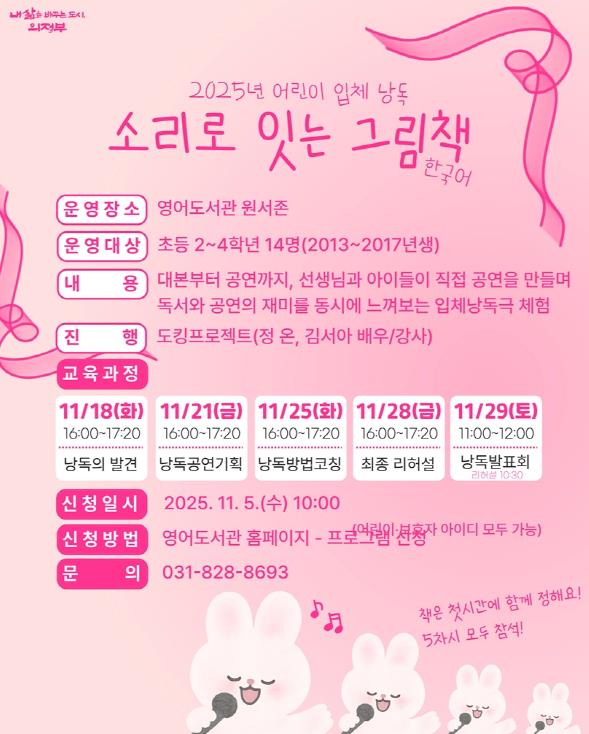 수강 신청은 11월 5일 수요일 오전 10시부터 의정부영어도서관 누리집에서 선착순으로 진행한다. 자세한 내용은 영어도서관 누리집 공지사항을 참고하거나 도서관정책팀으로 문의하면 확인할 수 있다.