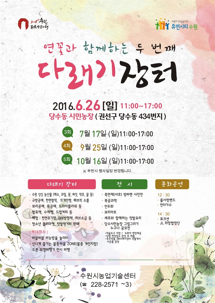 [세계로컬신문 최원만 기자] 경기 수원시는 오는 26일 당수동 시민농장에서 연꽃과 함께하는 두 번째 ‘다래기 장터’를 연다.