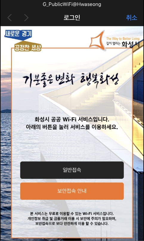 | ▲ 화성시 공공와이파이 접속 메인 화면. (사진=화성시 제공) |