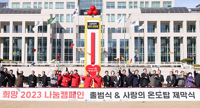 이장우 대전시장은 “대전은 주위의 이웃을 생각하는 나눔 문화가 발전하고 성숙한 도시”라며,“이번 나눔캠페인에도 대전 시민의 온정으로 사랑의 온도가 100도를 훌쩍 넘어, 따뜻하고 나눔으로 행복한 대전이 될 수 있도록 시민 여러분들의 많은 관심과 참여를 부탁드린다”고 당부했다.