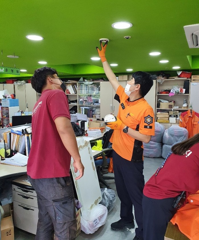 | ▲ 강화소방서 관계자가 다중이용시설을 방문해 화재경보기를 점검하고 있다. (사진=강화소방서 제공) |
