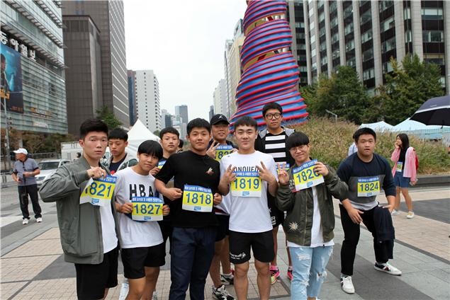 | ▲ 서울체육고등학교 레슬링부 선수들이 지난 1일 광화문 북광장에서 열린 제6회 환경보호와 학교폭력 예방을 위한 표어대회 및 사제동행 걷기대회에 참가해 기념촬영하고 있다.<사진=최달진 조사위원> |