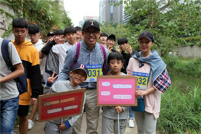 | ▲ 서울광남초등학교 1학년 김찬우 학생의 가족과 걷기대회 참여 학생들이 청계천에서 활짝 웃으면서 포즈를 취하고 있다. <사진=최달진 조사위원> |