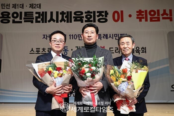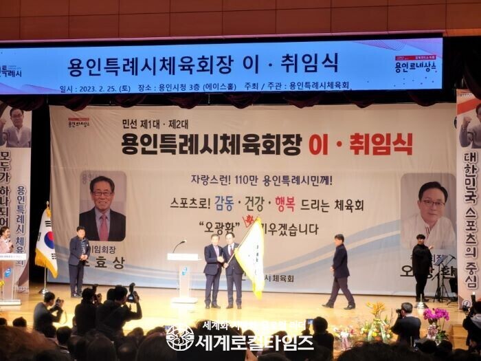 [세계로컬타임즈 이지안 기자] 용인시체육회는 25일 시청 에이스홀에서 민선 1기 조효상 회장 이임식과 민선 2기 오광환 회장의 취임식을 열렸다.