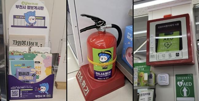 CU편의점 내 청년홍보 책자 등 시정 홍보물이 비치된 홍보게시대와 소화기, 자동심장충격기가 설치된 모습