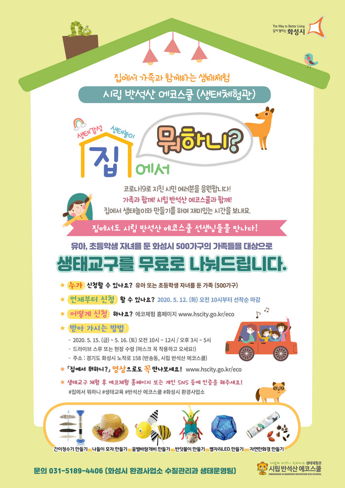 [세계로컬타임즈 최성우 기자] 화성시 시립 반석산 에코스쿨은 5월 가정의 달을 맞아 집에서 활용할 수 있는 생태교구 500개를 무료로 배포한다.