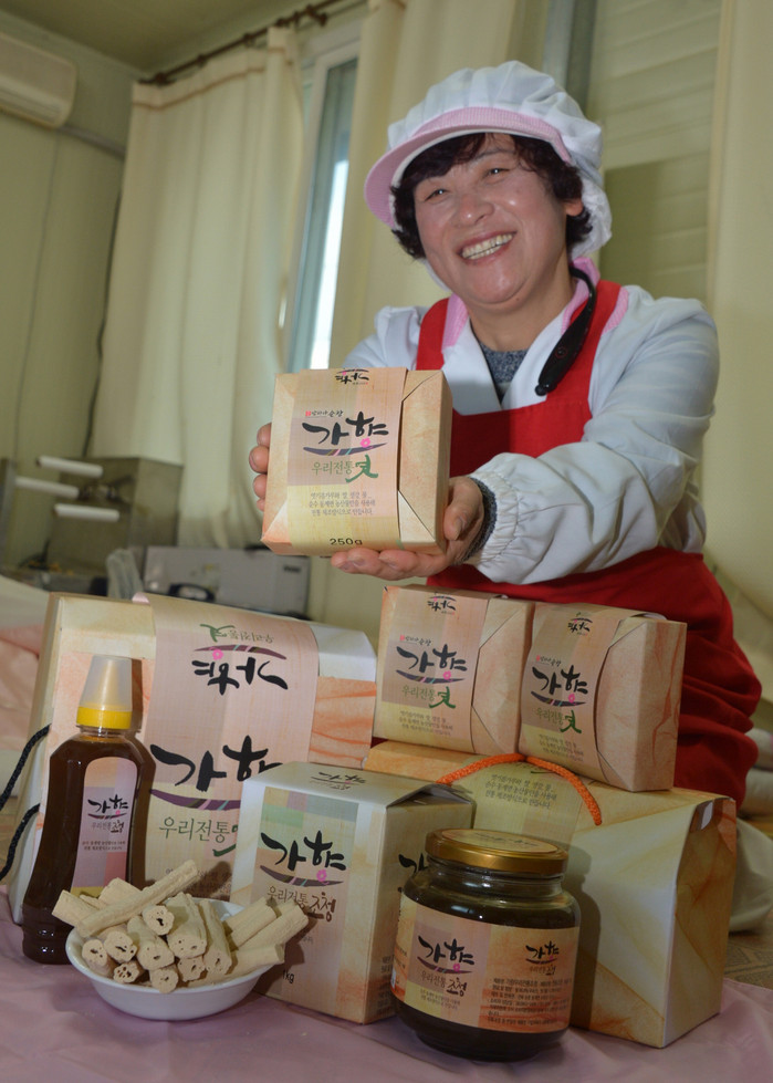 | ▲ 전북 순창군 동계면 가작마을 가향농원에서 주민이 엿기름가루와 쌀, 생강, 물 등 동계면에서 생산된 농산물만을 사용해 전통제조방식으로 만든 엿을 선보이고 있다. 특히 밥맛 좋은 신동진 우렁이 쌀로 만들기 때문에 맛이 좋다고 한다. 가향 전통엿 250g에 5000원, 1kg 1박스에 2만원이고 조청은 500g에 7000원 1kg에 1만3000원에 판매한다.<사진제공=순창군청> |