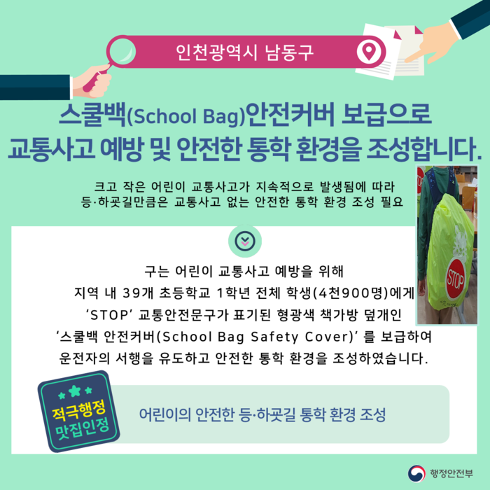 [세계로컬타임즈 장선영 기자] 인천 남동구의 어린이 교통사고 예방을 위한 `스쿨백 안전커버 보급` 사업이 행정안전부의 `지방자치단체 적극행정 맛집`에 선정됐다.