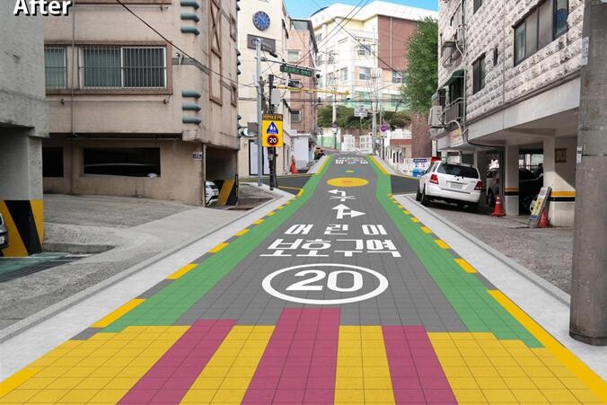보행공간 확보가 어려운 이면도로의 경우, 제한속도를 30km/h에서 20km/h로 하향하고 디자인 포장을 통해 차량의 속도를 낮추도록 유도한다.
