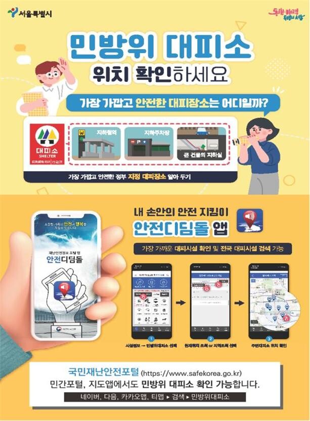 또 카카오톡 서울시 채널에서 ‘우리동네 민방위대피소는 어디’를 누르면 ‘안전디딤돌 앱’ 포함 모바일앱·웹 등을 통해 대피소를 확인하는 방법도 안내 중이다.
