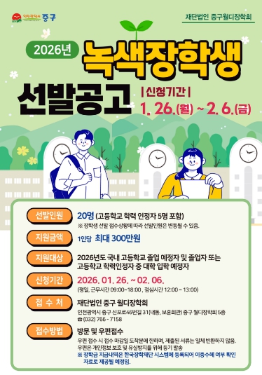 희망자는 오는 1월 26일부터 2월 6일까지 장학금 신청서 등 필수서류를 갖춰 중구 월디장학회(인천광역시 중구 신포로 46번길 31 중구보훈회관 5층)로 방문 또는 우편 신청하면 된다.
