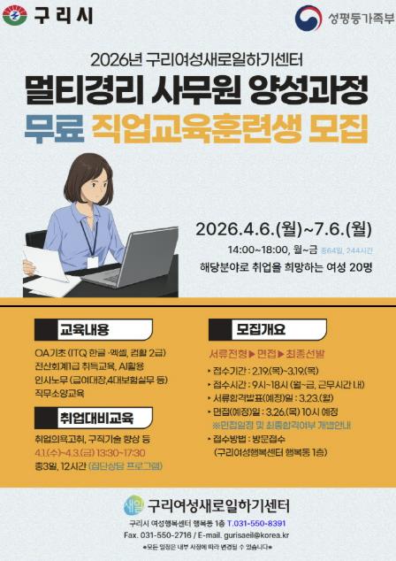 백경현 구리시장은 “이번 멀티경리 사무원 양성과정은 현장 수요 기반의 실무 중심 교육과 체계적인 취업 연계를 통해 여성의 안정적인 일자리 진입과 고용유지를 동시에 지원하는 프로그램”이라며 “사무·회계·행정 분야 취업을 희망하는 여성들의 많은 관심과 참여를 바란다”라고 밝혔다.