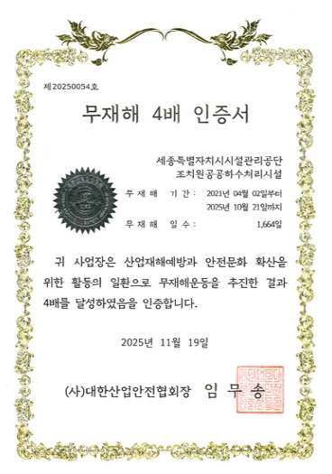 조소연 이사장은 “이번 인증은 전 직원이 함께 만들어낸 안전관리 성과”라며 “앞으로도 환경기초시설이 더욱 안전하게 운영될 수 있도록 꾸준한 관심과 노력을 이어가겠다”고 말했다.
