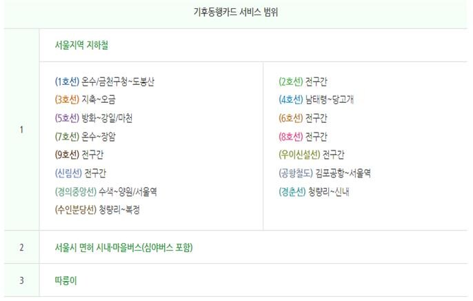 서비스 구간은 서울지역 내 지하철, 심야버스를 포함한 서울시 면허 시내ㆍ마을버스와 공공자전거인 따릉이가 포함된다. 신분당선 및 타 시ㆍ도 면허버스, 광역버스는 제외된다.