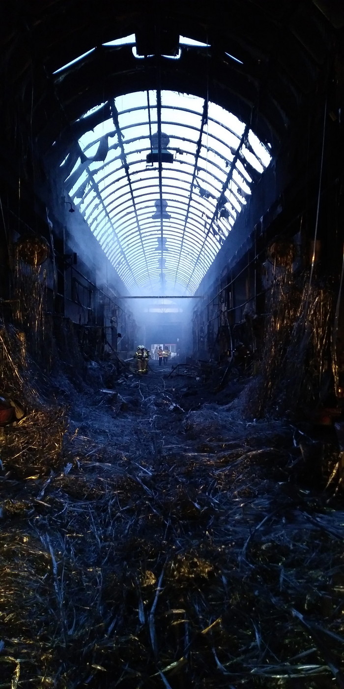 | ▲ 화마가 할퀴고 간 수산시장이 전소돼 소방대원들이 화재 조사를 하고 있다. (사진=인천 강화소방서) |