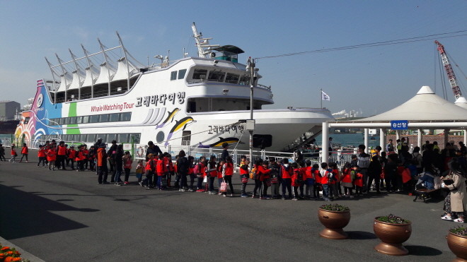 | ▲ 지난 15일 울산 남구 장생포구의 고래탐사를 위해 선착장에서 어린이 승객들이 고래바다여행선에 승선하려고 줄을 서 있는 모습.<사진제공=울산 남구청> |
