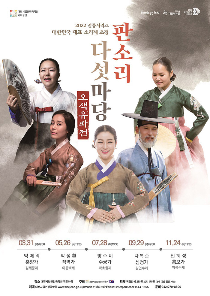 [세계로컬타임즈 민순혜 기자] 대전시립연정국악원이 TJB대전방송(이하 TJB)과 공동주최로 2022전통시리즈 대한민국 대표 소리제 초청 ‘판소리 다섯 마당, 오색 유파 전’을 오는 31일부터 11월 24일까지 진행한다고 밝혔다.