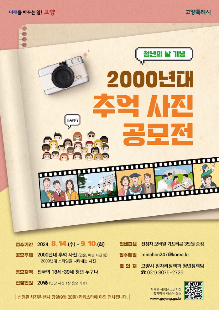 [세계로컬타임즈 이효진 기자]고양특례시는 '2024 고양 청년의 날'을 기념해 9월 10일까지 2000년대 추억 사진 공모전을 진행한다고 밝혔다.