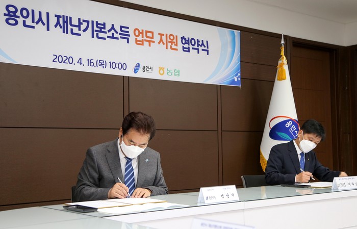 [세계로컬타임즈 최성우 기자] 용인시는 시청 시장실에서 NH농협은행 용인시지부 및 지역 농·축협과 재난기본소득 신청 접수창구를 확대 운영하기 위한 업무협약을 체결했다.