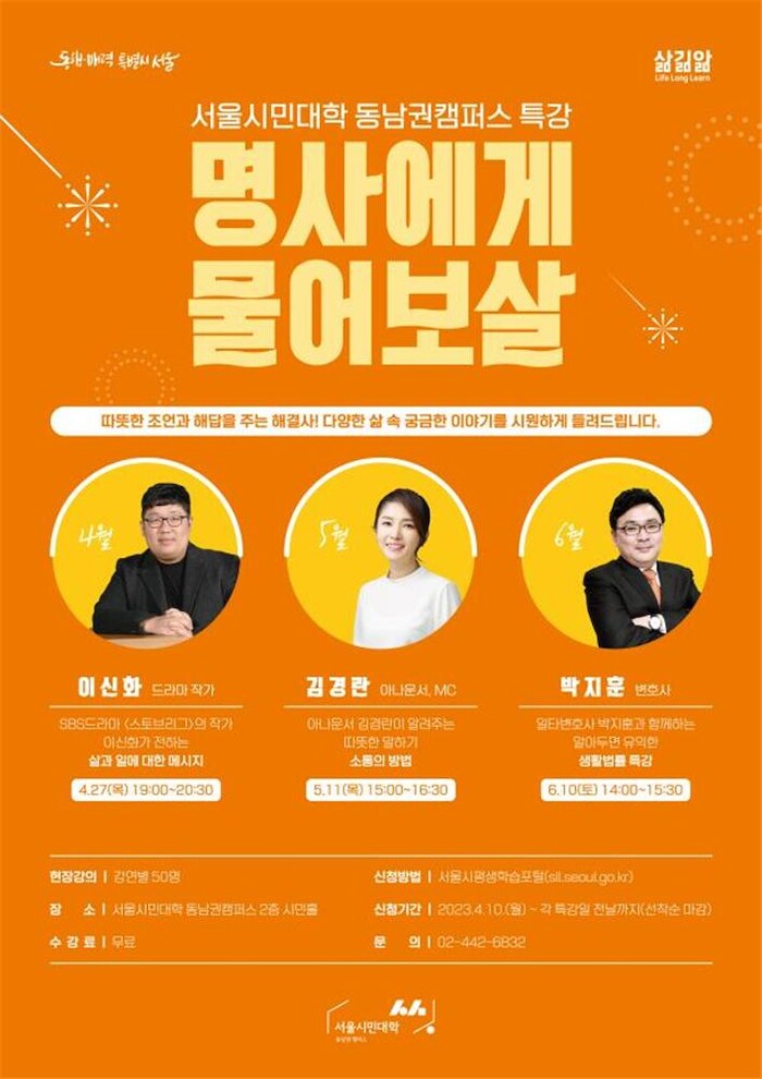 [세계로컬타임즈 이효진 기자] 서울시민대학 명사특강 시리즈 ‘명사에게 물어보살’이 오는 27일부터 상·하반기 각 3회씩, 총 6회에 걸쳐 서울 강동구 동남권캠퍼스에서 개최한다.