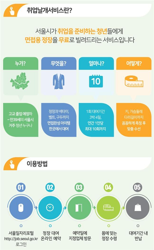 면접정장 대여를 원하는 청년은 서울일자리포털 ‘취업날개 서비스’ 메뉴에서 ▲원하는 정장 대여업체 선택 ▲방문날짜와 시간 예약 ▲ 정해진 시간에 맞춰 방문하면 이용이 가능하다.
