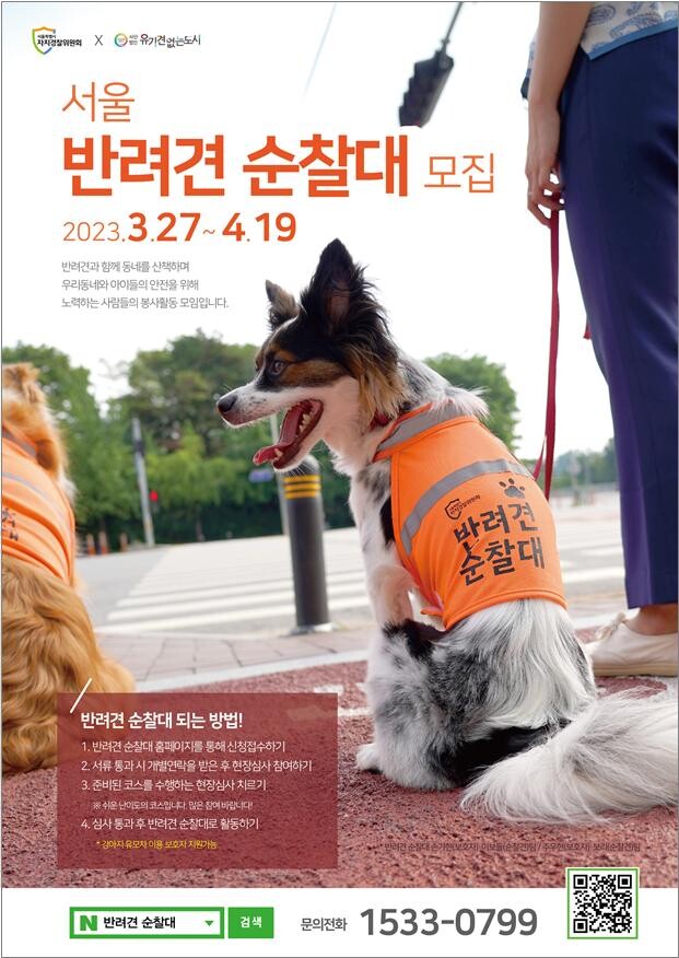 [세계로컬타임즈 이효진 기자] 서울특별시 자치경찰위원회는 ‘서울 반려견 순찰대’를 서울의 자치구 25곳으로 확대하고, 4월19일까지 참여자를 모집한다.