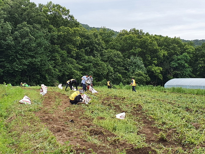 체육회원들은 어려운 농가를 돕기 위해 무더운 날씨에도 불구하고 약 3,500㎡ 면적에서 감자 캐기 작업을 진행했다.