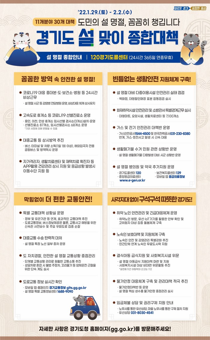 경기도의 2022년 설 연휴 종합대책은 ➊종합상황실 및 생활정보 안내 ➋코로나19 감염병 대응 ➌설 연휴 응급진료 대책 ➍물가안정 ➎소외계층 지원 ➏교통‧수송대책 ➐안전사고 대응 ➑가축 및 농축수산물 안전관리 ➒쓰레기 및 환경오염 예방・특별감시 ➓자치경찰 종합치안 ⓫공직기강 확립 및 공무원 집단감염 대책 마련 등 총 11개 종합분야로 구성됐다.
