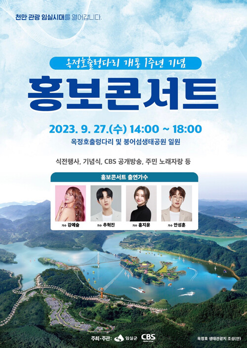 심민 군수는 “옥정호 출렁다리 개통 1주년을 기념하고 추석을 맞아 고향을 방문하시는 귀성객과 관광객들을 위해 흥겨운 홍보콘서트를 개최한다”며 “아름다운 옥정호의 풍광을 배경으로 가족·친구들과 함께 공연을 즐기며 일상의 활력을 되찾고 멋진 추억도 만들 수 있는 뜻깊은 자리가 될 것”이라고 말했다.