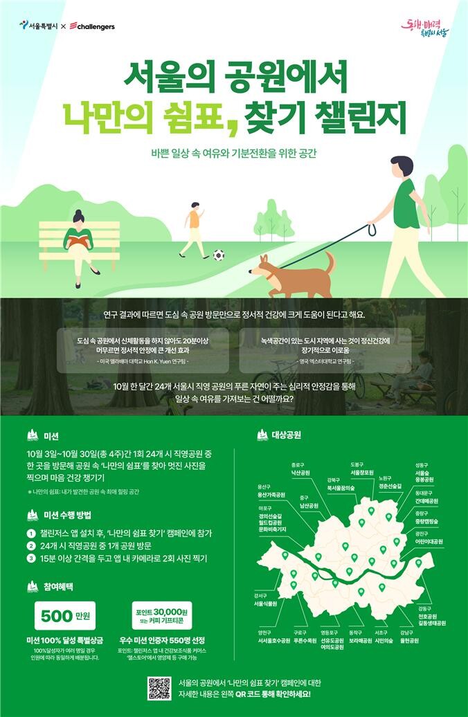 24개 공원 중 한 곳을 방문해 15분 이상 머물고 휴식하는 동안 가장 마음에 들었던 공원 속 장소를 사진으로 찍어 ‘챌린저스’ 앱에 인증하면 참여가 완료된다.