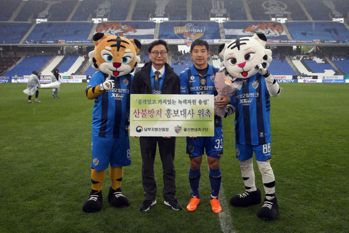 [세계로컬신문 최옥성 기자] 남부지방산림청(청장 최수천)은 14일 울산 문수축구경기장에서 봄철 건조기 산불에 대한 경각심 고취 및 산림에 대한 올바른 이해와 산림사랑 정신을 함양시키고자 그린스포츠 문화를 선도하는 울산 현대축구단과 함께하는 '산불 없는 푸른 숲 캠페인'을 실시했다.