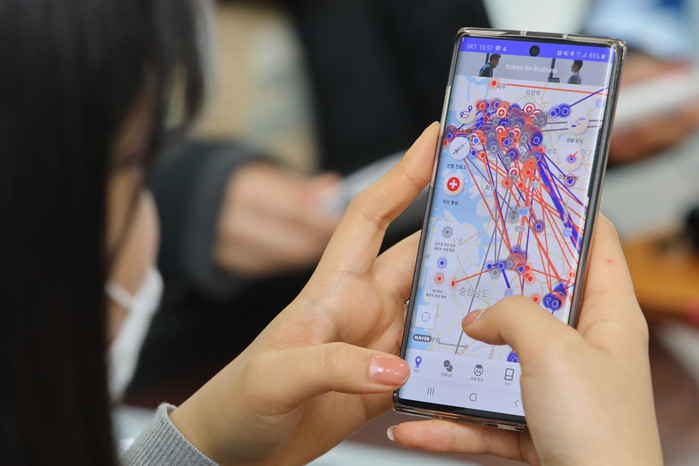 | ▲ 인하대 학생이 ‘코로나 닥터’ 어플리케이션을 이용해 확진자 이동 경로를 확인하고 있다. (사진=인하대 제공) |