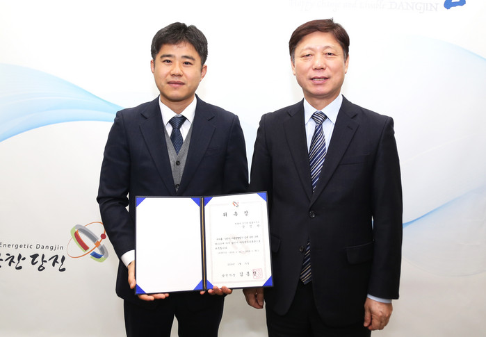 | ▲ 심병섭 당진시 부시장(오른쪽)이 아동권리옹호관으로 위촉된 강신관 변호사와 함께 기념촬영을 하고 있다. |