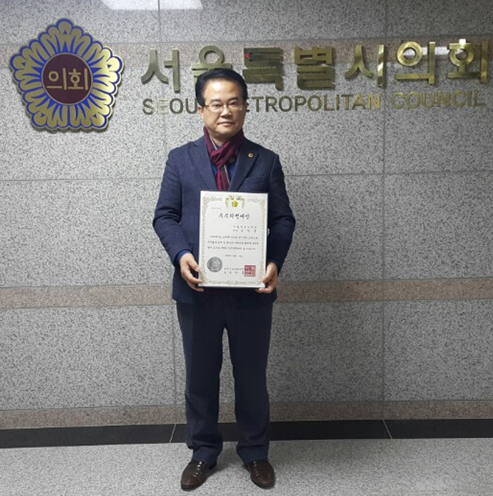 | ▲ 유찬종 서울시의원이 제5회 전국시도의장협의회 의정대상을 수상하고 기념촬영을 하고 있다. <사진제공=서울시의회> |