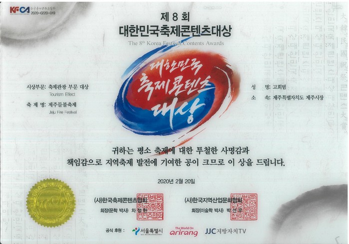 들불축제는 지역경제 및 관광활성화에 기여하고 지역축제를 세계적인 축제로 거듭날 수 있도록 추진해 축제관광부분에서 대상을 수상했다.