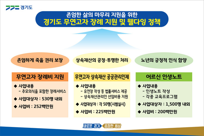 기존에는 무연고 사망자가 발생했을 경우 별다른 의례 없이 매장하거나 화장해 봉안했다. 도는 무연고자가 존엄한 죽음을 맞이할 수 있도록 추모 의식을 진행하기로 하고 기초지방정부에 사망자 1인당 160만 원 이내의 장례비를 지원한다.