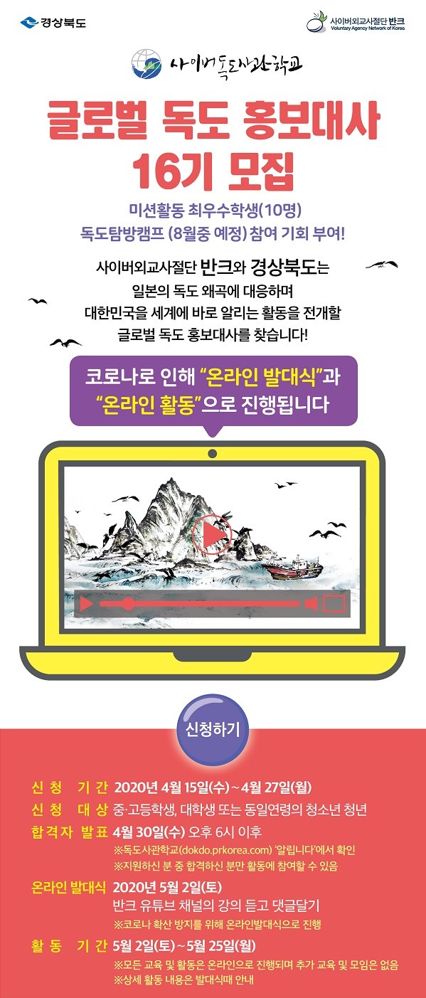 글로벌 독도홍보대사는 경상북도가 후원하고 반크(VANK)가 운영하는 사이버 독도사관학교를 통해 모집신청을 받았다.