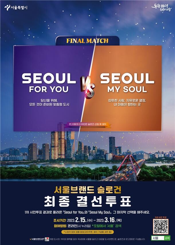 지난 조사 결과 전체 1위는 Seoul, my soul(37.3%), 2위는 Seoul for you(34.9%)로, 최종 9,641표 차이(총 투표 수의 2.4%)였으며, 내국인은 Seoul for you, 외국인은 Seoul, my soul을 각각 1위로 선택해 최종 결선 투표를 실시했다.