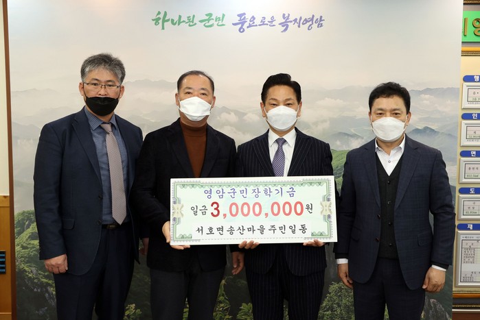 [세계로컬타임즈 강석운 기자] 지난 11일 서호면 송산마을(이장 전철희)에서 3백만원을 재단법인 영암군민장학회 장학기금 기탁으로 2022년 장학금 기탁의 포문을 열었다.