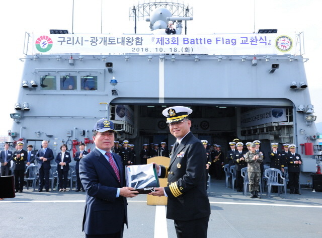 [세계로컬신문 고성철 기자]구리시(시장 백경현)는 지난 18일 오전 자매부대인 해군 제1함대 광개토대왕함을 방문해‘베틀 플래그 교환식’을 했다.