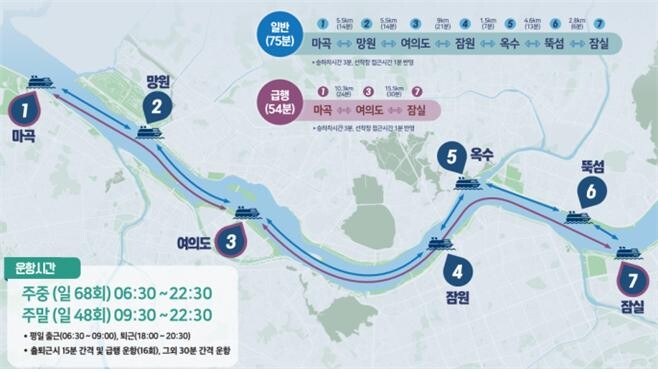 마곡·여의도·잠실 선착장 3곳만 정차하는 ‘급행노선’도 출퇴근 시간대에 16회 운항한다.